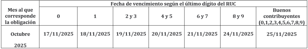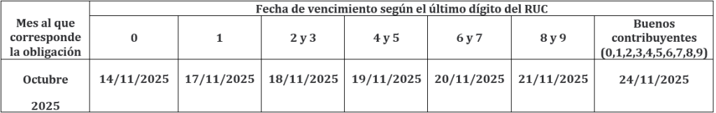 Por otro lado, las fechas de vencimiento de las obligaciones mensuales correspondientes al mes de octubre 2025 son los siguientes: