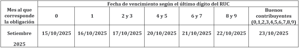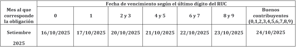 Por otro lado, las fechas de vencimiento de las obligaciones mensuales correspondientes al mes de setiembre 2025 son los siguientes: