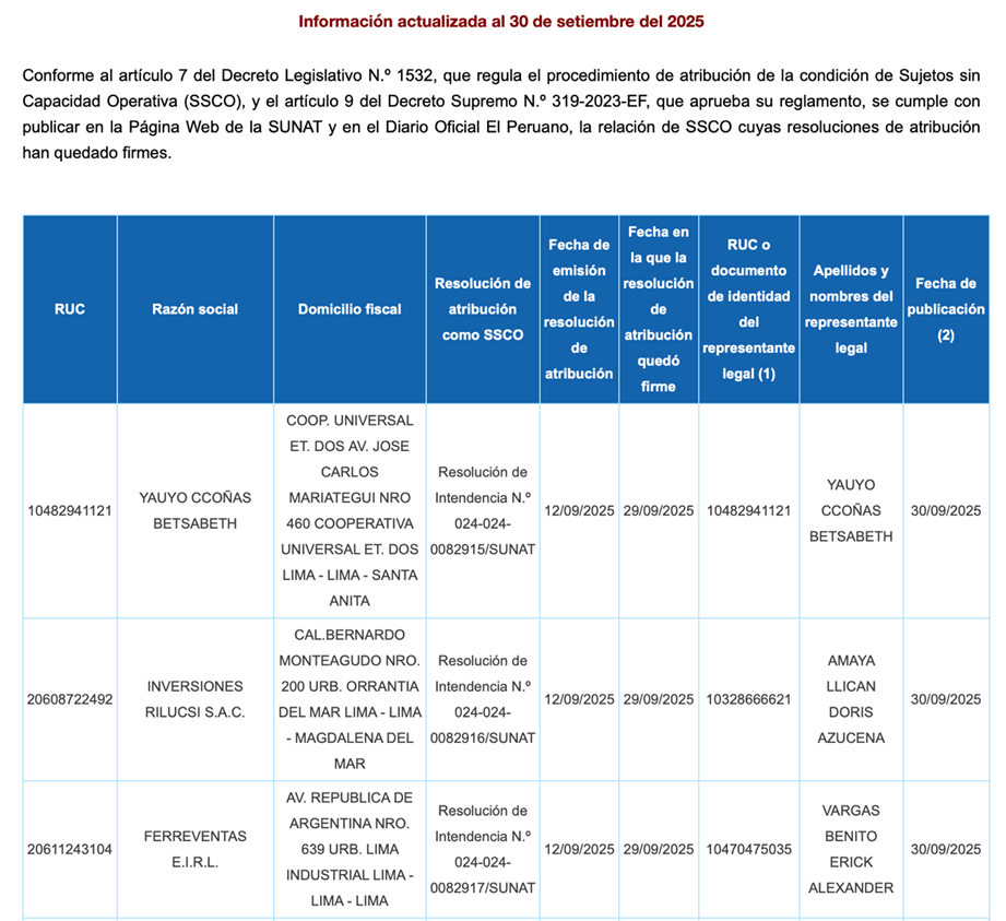 ATENCIÓN: Sunat publica nueva lista de sujetos calificados como sin capacidad operativa (SSCO)