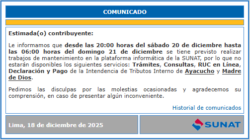 Sunat informó, a través de su portal institucional, que los servicios de Trámites, Consultas, RUC en Línea y Declaración y Pago de la Intendencia de Tributos Internos de Ayacucho y Madre de Dios no estarán disponibles desde las 20:00 horas del sábado 20 hasta las 06:00 horas del domingo 21 de diciembre de 2025, debido a trabajos de mantenimiento programados.