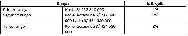 En consecuencia, los rangos establecidos en el artículo 5 de la Ley Nº 28258, Ley de Regalía Minera convertidos a moneda nacional son los siguientes: