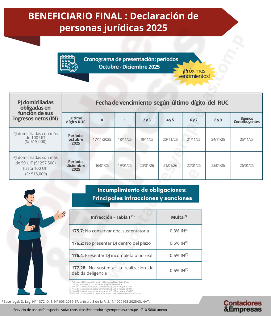 Compartimos con Uds., que detalla los principales aspectos sobre la Declaración del Beneficiario Final 2025 para personas jurídicas domiciliadas, incluyendo el cronograma de presentación, los sujetos obligados en función de sus ingresos netos y las infracciones y sanciones aplicables, conforme a lo señalado por la Sunat.
