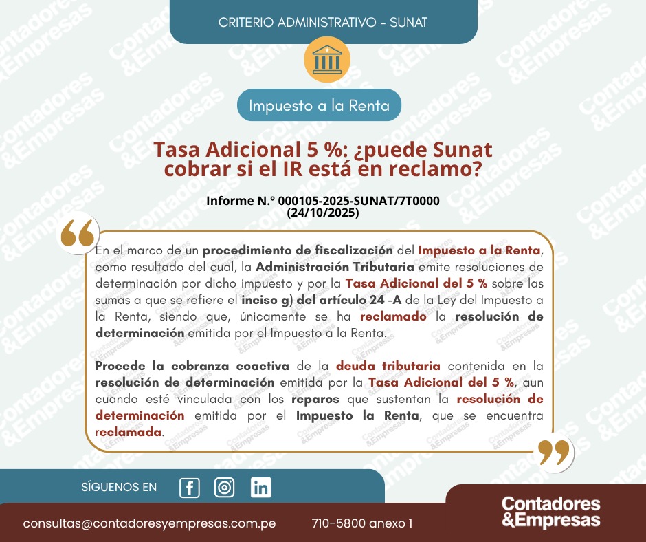 Informe Sunat |Tasa Adicional 5 %: ¿puede Sunat cobrar si el IR está en reclamo?