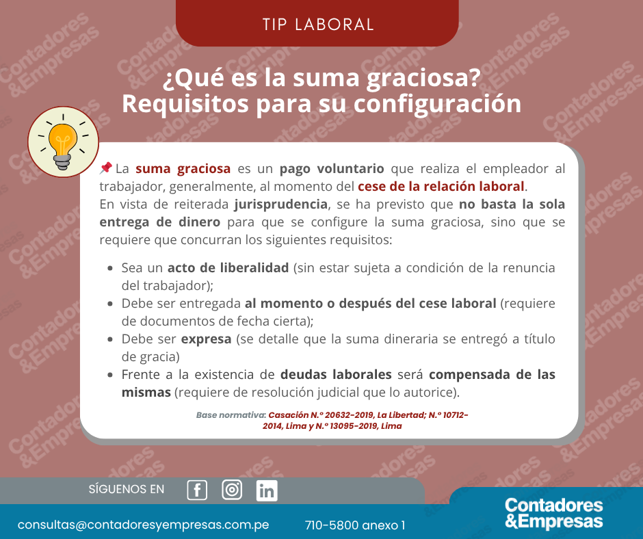 Compartimos con Uds. un Tip Laboral que explica qué es la suma graciosa y detalla los requisitos para su configuración, de acuerdo con la jurisprudencia vigente.