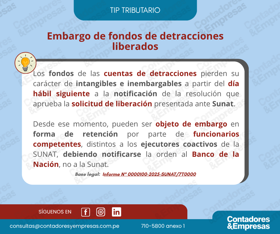 Compartimos con Uds. un Tip Tributario que precisa que los fondos de detracciones liberados pueden ser embargados desde el día hábil siguiente a la notificación de su liberación, debiendo notificarse la medida al Banco de la Nación.